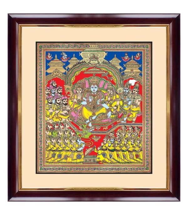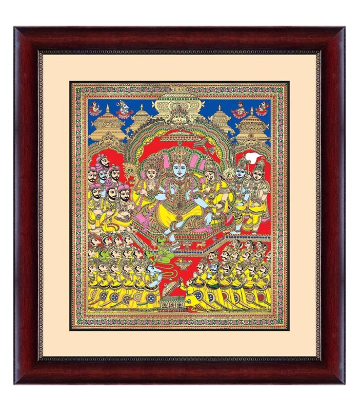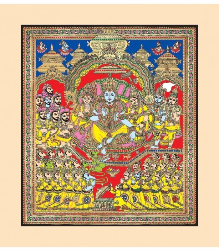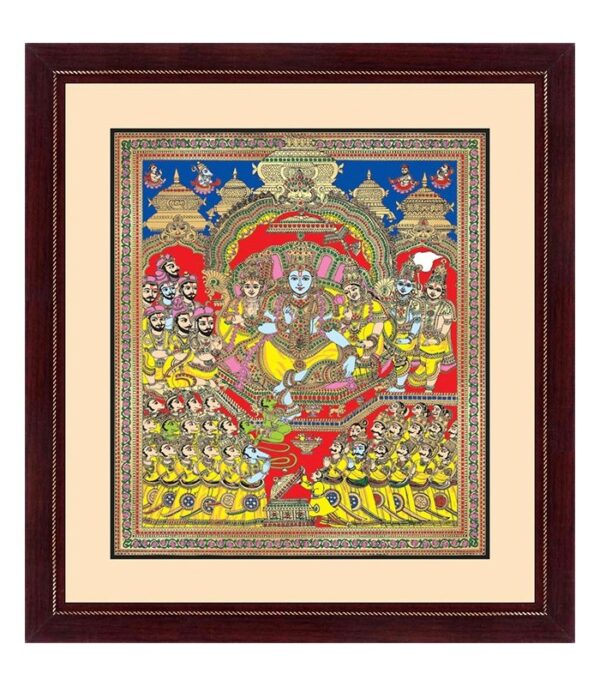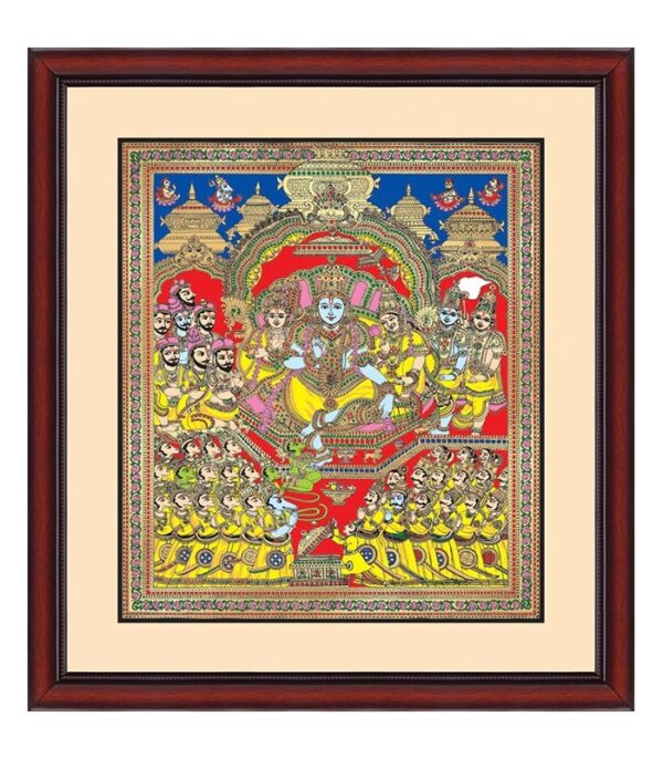 Presented in Thanjavur style, with semi-precious and precious jewels like rubies, emeralds etc., this epic scenery of crowning of Lord Sri Rama and Sita in Ayodhya has an eternal attraction.